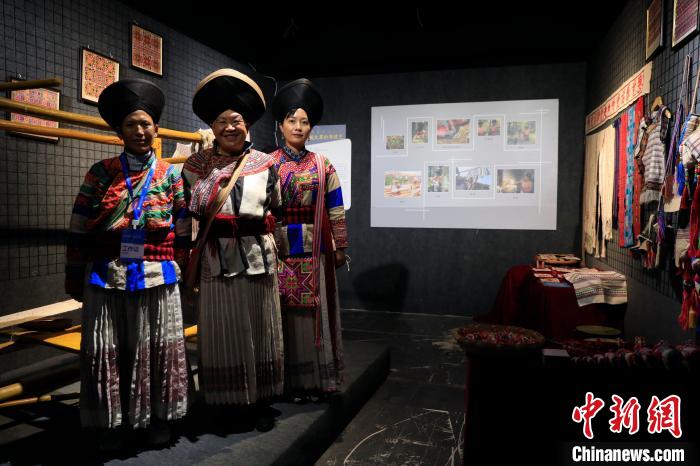 傈僳族火草織布技藝展區(qū),身著火草麻布百褶裙的熊國(guó)秀(左二)?!⊥趵?攝
