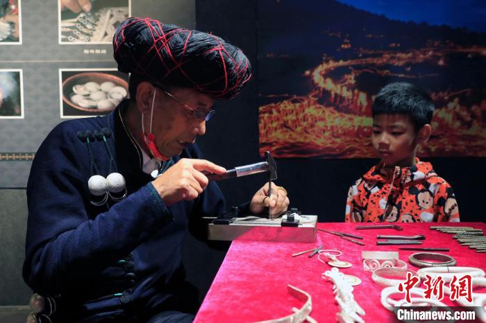 中新網(wǎng)涼山11月7日電 (王利文)“叮咚,叮咚……”6日,清脆的敲打聲從四川涼山民族體育場(chǎng)傳出,在“家園遺珍·時(shí)代新風(fēng)”非遺展演活動(dòng)中,彝族銀飾制作技藝國(guó)家級(jí)非遺傳承人勒古沙日正在打制銀器。鷹爪銀杯、鳳冠、胸牌……現(xiàn)場(chǎng)一件件閃亮精致的銀器均出自這位66歲老人之手。