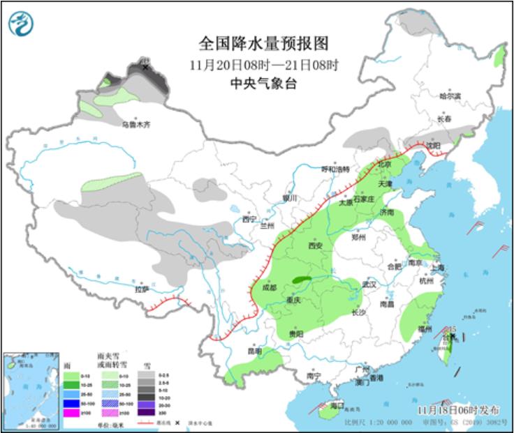 11月18日08時(shí)至19日08時(shí),內(nèi)蒙古中東部、黑龍江西部、河北北部等地部分地區(qū)有小到中雪或雨夾雪,其中,內(nèi)蒙古東北部部分地區(qū)有中到大雪(5~8毫米)。華北西部、黃淮、江淮、江漢、江南、西南地區(qū)東部、華南西部等地部分地區(qū)有小到中雨,其中,廣西西北部、湖南東部、江西中部、浙江南部等地部分地區(qū)有大雨。內(nèi)蒙古中部部分地區(qū)有5~6級(jí)風(fēng)(見(jiàn)圖2)。東海北部海域?qū)⒂?~7級(jí)、陣風(fēng)8級(jí)的偏東風(fēng)。