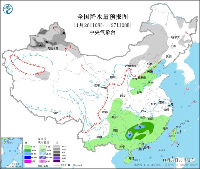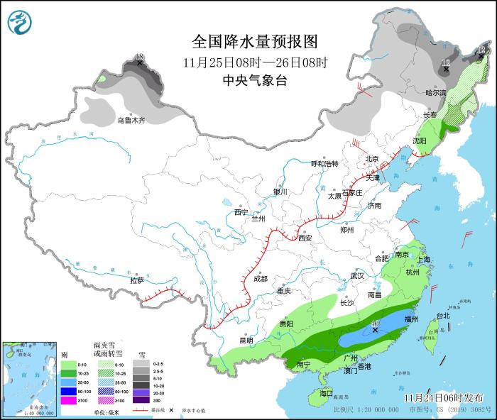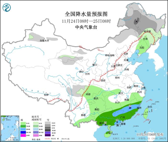 11月24日08時(shí)至25日08時(shí),內(nèi)蒙古東部、東北地區(qū)、新疆沿天山地區(qū)、甘肅河西、川西高原等地部分地區(qū)有小到中雪或雨夾雪,其中,內(nèi)蒙古東北部局地有大雪(5~7毫米)。江南南部、華南大部等地部分地區(qū)有中到大雨,局地暴雨(50~60毫米)。內(nèi)蒙古西部部分地區(qū)有5~7級風(fēng)(見圖1)。
