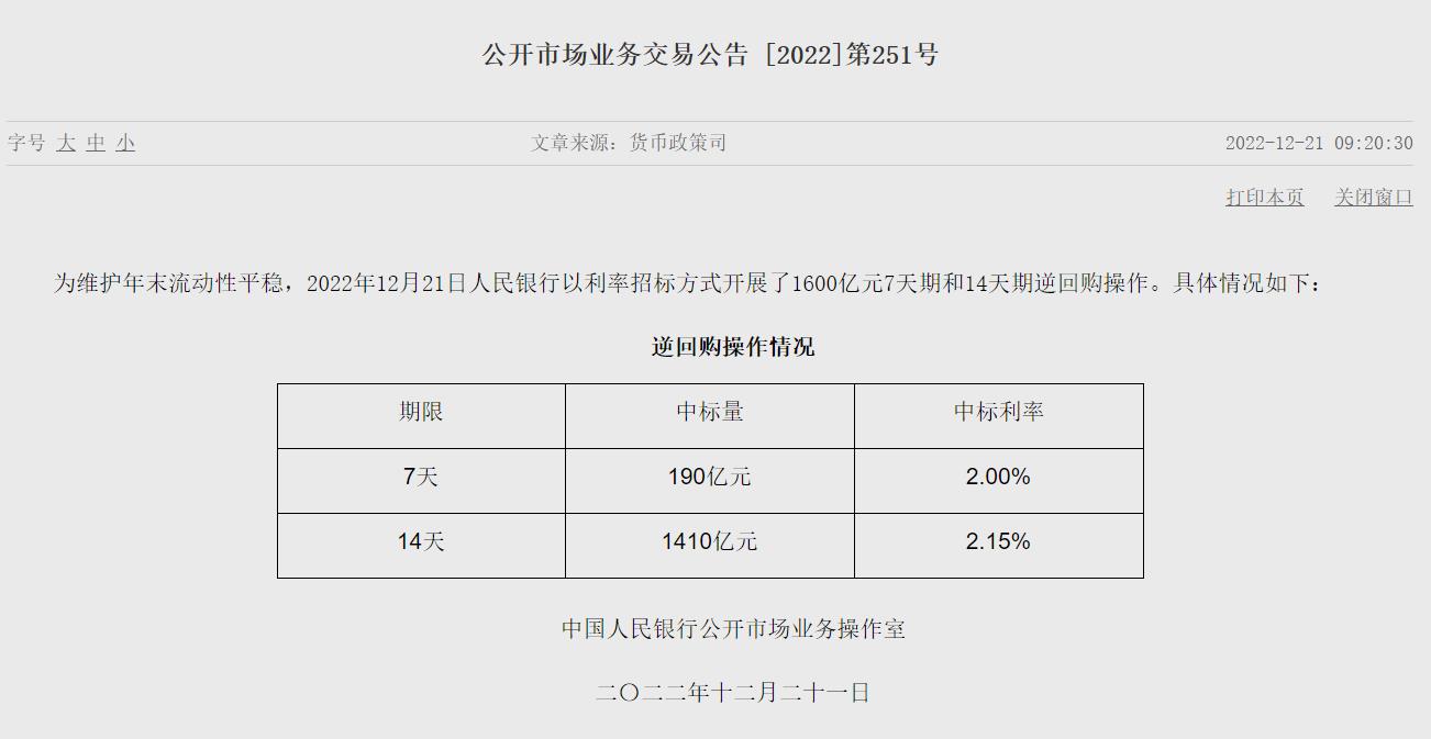 中新網(wǎng)12月21日電 據(jù)央行官網(wǎng)消息,為維護(hù)年末流動(dòng)性平穩(wěn),2022年12月21日人民銀行以利率招標(biāo)方式開展了1600億元7天期和14天期逆回購(gòu)操作。中標(biāo)利率分別為2.00%和2.15%。(中新財(cái)經(jīng))