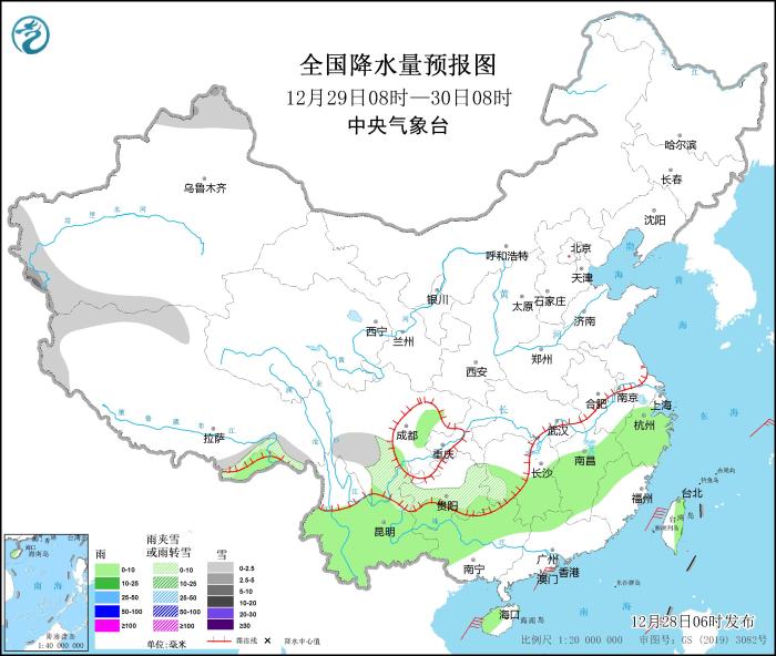 12月29日08時(shí)至30日08時(shí),新疆北疆北部和南疆山區(qū)、西藏西北部和東南部、川西高原南部、云南東北部、貴州中南部等地部分地區(qū)有小雪或雨夾雪,其中,新疆阿勒泰和南疆山區(qū)等地局地有中雪或大雪。江南大部、四川盆地中部、云南大部、貴州南部、華南北部、海南島西部、臺(tái)灣島東部等地部分地區(qū)有小雨,其中,臺(tái)灣島東部局地有中雨。東海南部、臺(tái)灣海峽及以東洋面、巴士海峽、南海大部等地部分地區(qū)有6~7級(jí)風(fēng)(見(jiàn)圖2)。