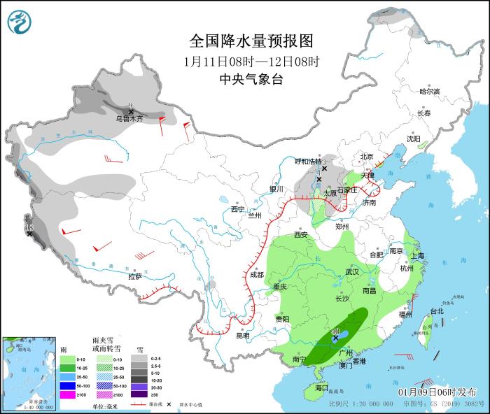 1月9日08時(shí)至10日08時(shí),新疆北部和西部山區(qū)、西藏西部等地部分地區(qū)有小到中雪,其中,新疆北疆北部、西藏西部局地有大到暴雪(10~18毫米)。江南中南部、華南大部、臺(tái)灣島等地部分地區(qū)有小到中雨,其中,廣東東北部和西南部沿海、海南島北部等地局地有大雨(25~45毫米)。西藏中西部等地部分地區(qū)有5~7級(jí)風(fēng)(見圖1)。