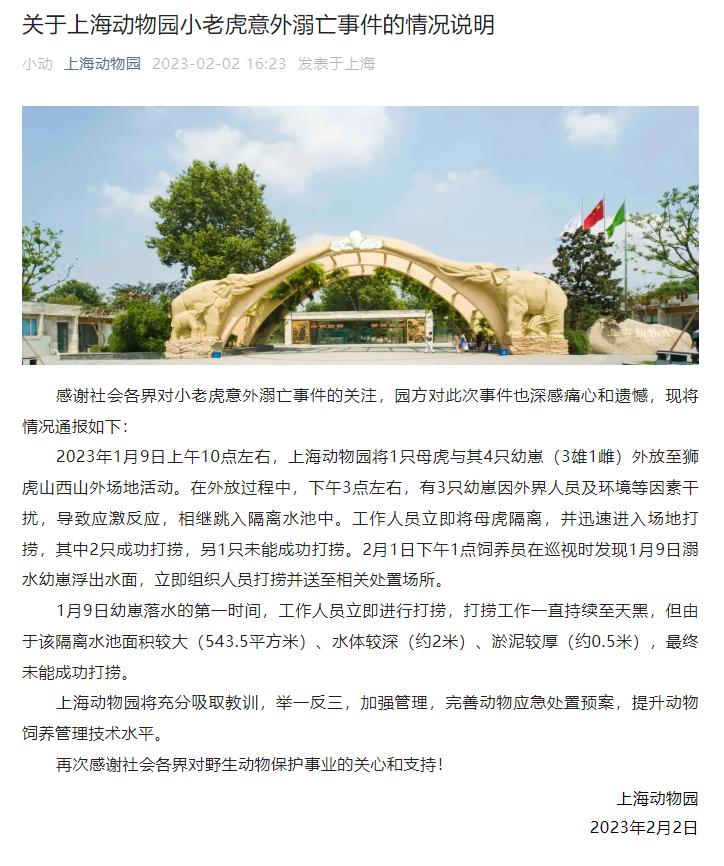 中新網(wǎng)2月2日電 據(jù)“上海動(dòng)物園”微信公眾號(hào)消息,上海動(dòng)物園2日發(fā)布關(guān)于上海動(dòng)物園小老虎意外溺亡事件的情況說(shuō)明,2023年1月9日上午10點(diǎn)左右,上海動(dòng)物園將1只母虎與其4只幼崽(3雄1雌)外放至獅虎山西山外場(chǎng)地活動(dòng)。在外放過(guò)程中,下午3點(diǎn)左右,有3只幼崽因外界人員及環(huán)境等因素干擾,導(dǎo)致應(yīng)激反應(yīng),相繼跳入隔離水池中。工作人員立即將母虎隔離,并迅速進(jìn)入場(chǎng)地打撈,其中2只成功打撈,另1只未能成功打撈。2月1日下午1點(diǎn)飼養(yǎng)員在巡視時(shí)發(fā)現(xiàn)1月9日溺水幼崽浮出水面,立即組織人員打撈并送至相關(guān)處置場(chǎng)所。