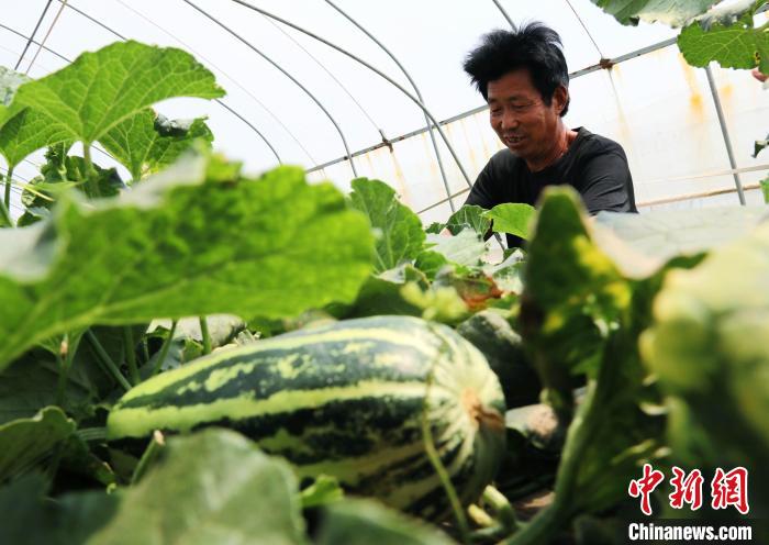 資料圖:村民正在大棚里管理甜瓜。 郜玉華 攝