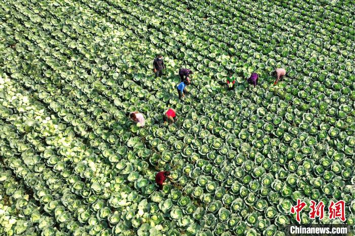 資料圖:村民在收獲甘藍(lán)菜。(無人機(jī)照片) 郜玉華 攝