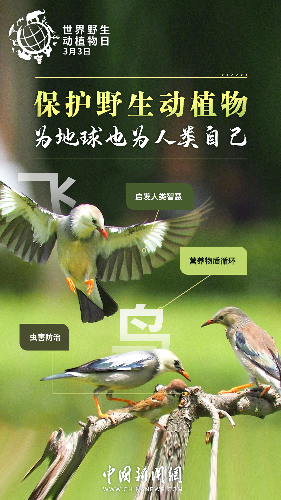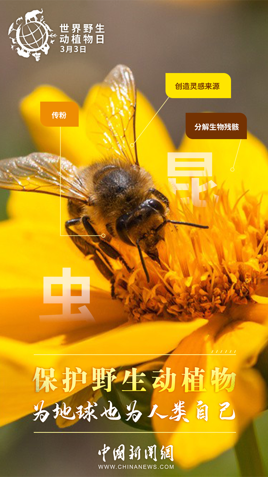 世界約80%的農(nóng)作物都依賴蜜蜂等蟲(chóng)媒傳粉,一座鯨的尸體可以供養(yǎng)一套以分解者為主的循環(huán)系統(tǒng)長(zhǎng)達(dá)百年……其實(shí),大自然里的每種生物都有它存在的價(jià)值。今天是第十個(gè)“世界野生動(dòng)植物日”,戳圖了解它們的作用,一起來(lái)保護(hù)野生動(dòng)植物。
