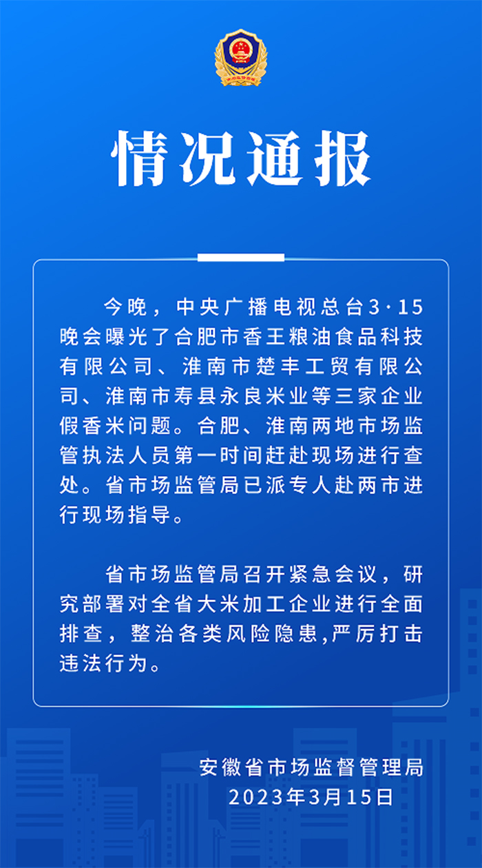 安徽省市場(chǎng)監(jiān)督管理局15日晚發(fā)布情況通報(bào)稱,合肥、淮南兩地市場(chǎng)監(jiān)管執(zhí)法人員第一時(shí)間趕赴現(xiàn)場(chǎng)進(jìn)行查處。安徽省市場(chǎng)監(jiān)管局已派專人赴兩市進(jìn)行現(xiàn)場(chǎng)指導(dǎo)。
