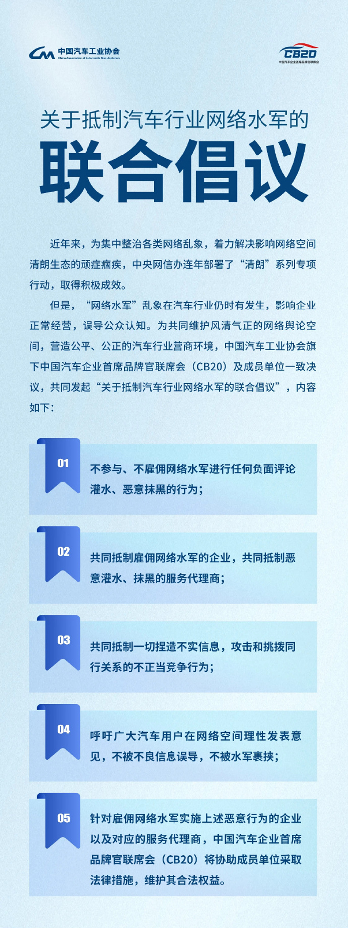 中新網(wǎng)3月24日電(中新財(cái)經(jīng) 葛成) 24日,中新財(cái)經(jīng)從中汽協(xié)獲悉,為共同維護(hù)風(fēng)清氣正的網(wǎng)絡(luò)輿論空間,營(yíng)造公平、公正的汽車行業(yè)營(yíng)商環(huán)境,中國(guó)汽車工業(yè)協(xié)會(huì)旗下中國(guó)汽車企業(yè)首席品牌官聯(lián)席會(huì)(CB20)及成員單位一致決議,共同發(fā)起“關(guān)于抵制汽車行業(yè)網(wǎng)絡(luò)水軍的聯(lián)合倡議”。