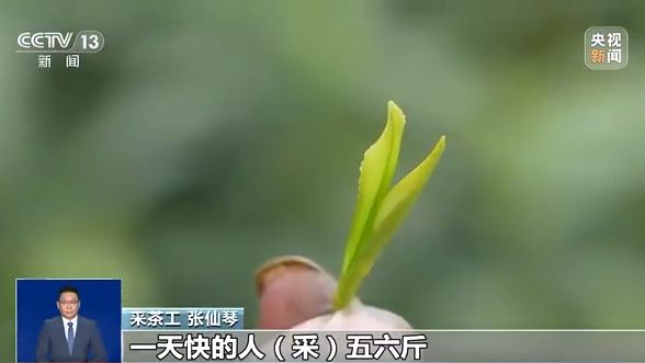 采茶工 張仙琴:我采茶差不多有二十七八年了,這個(gè)嫩芽(采摘)我們手工采的話(huà),一天快的人(采)五六斤,慢的人(采)兩斤多。