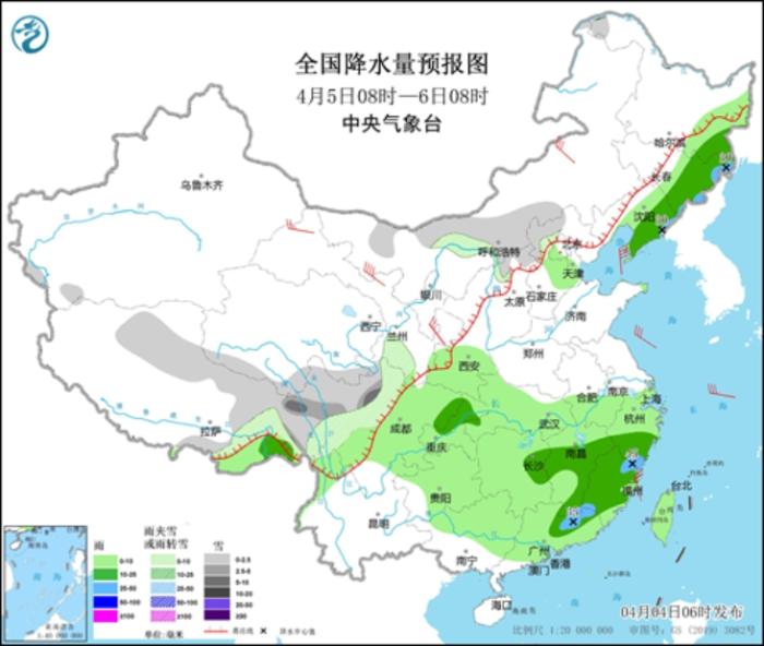 圖3 全國降水量預(yù)報圖(4月4日08時-5日08時)