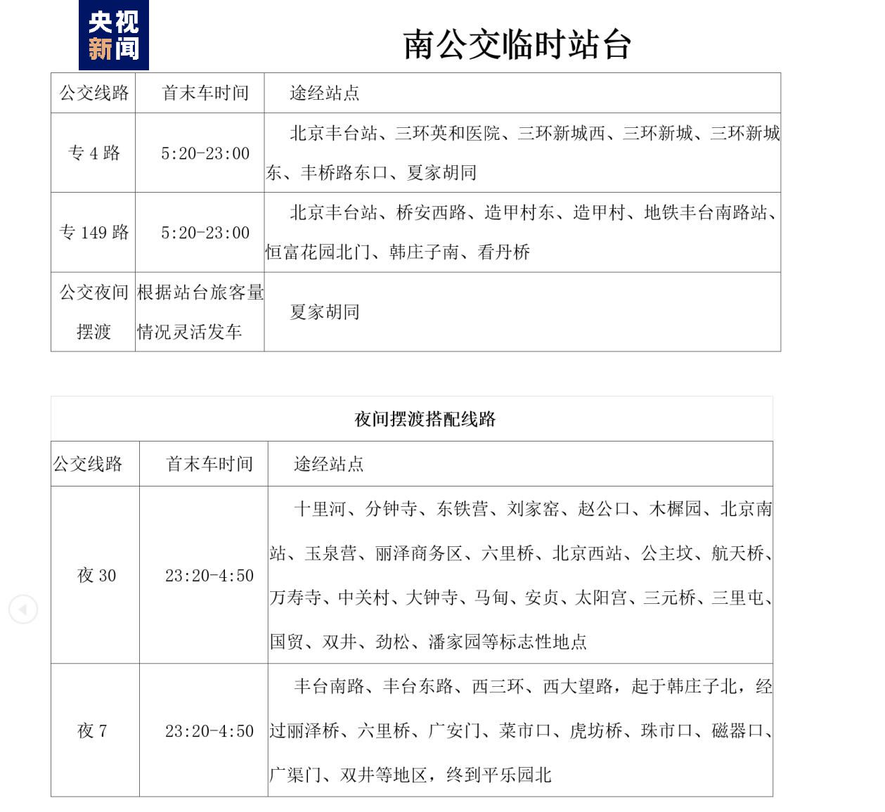 0時(shí)至5時(shí),北京豐臺(tái)站,在出租車(chē)調(diào)度站及南廣場(chǎng)臨時(shí)公交站臺(tái)區(qū)域設(shè)有免費(fèi)擺渡車(chē)幫助旅客離站,共計(jì)兩個(gè)方向,具體如下: