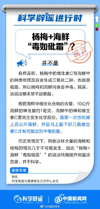 中新網(wǎng)7月14日電 有傳言稱,楊梅中的維生素C與海鮮中的砷類物質(zhì)反應(yīng)會生成三氧化二砷,也就是砒霜。這個說法科學(xué)嗎?戳圖片了解真相↓(來源:科學(xué)辟謠、中國新聞網(wǎng)微博)