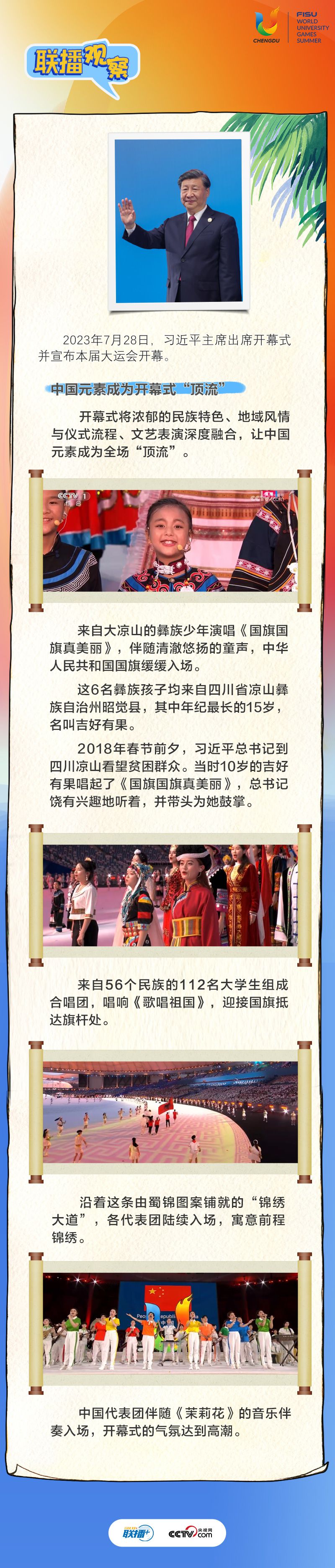 7月28日晚,第31屆世界大學(xué)生夏季運(yùn)動會開幕式在四川省成都市舉行。習(xí)近平主席出席開幕式并宣布本屆大運(yùn)會開幕。