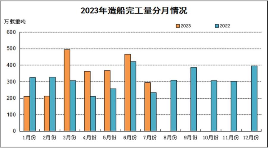 1-7月,全國造船完工2409萬載重噸,同比增長15.6%。承接新船訂單4476萬載重噸,同比增長74%。7月底,手持船舶訂單12790萬載重噸,同比增長23.4%。