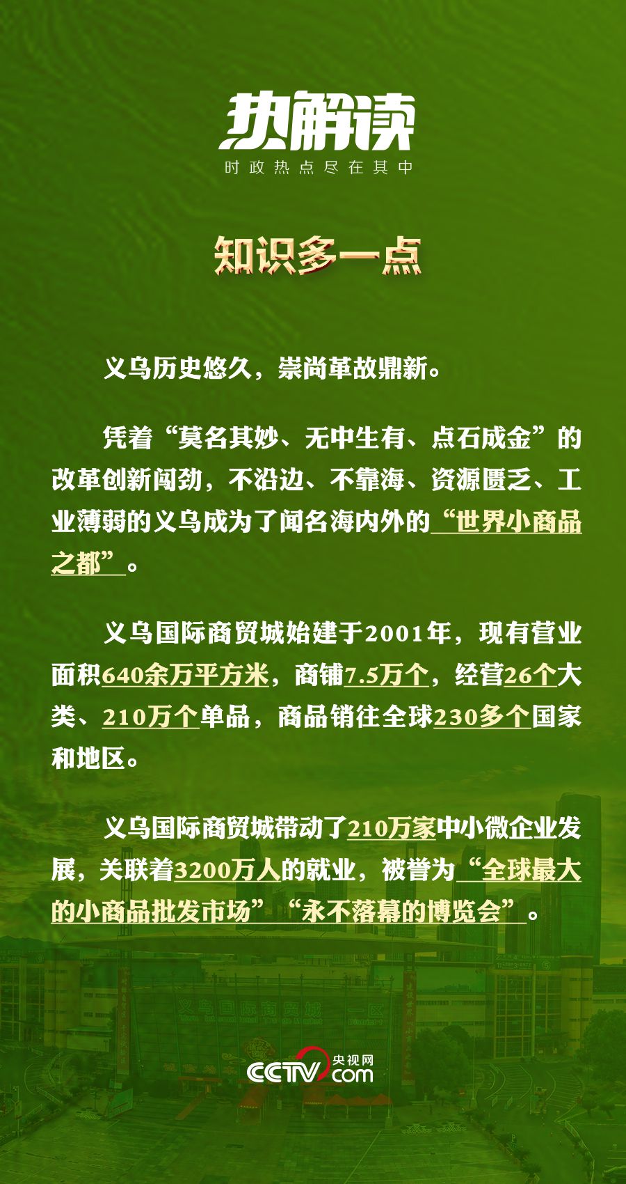 9月20日,習近平總書記到浙江考察的第二站,是義烏國際商貿(mào)城。走進這座“買賣全球”的“世界超市”,總書記考察了五金工具配件商鋪、傘鋪等,詳細了解義烏國際商貿(mào)城發(fā)展對外貿(mào)易、推動高質(zhì)量發(fā)展等情況,并鼓勵商戶們:“義烏的小商品、大市場,不斷地再造新的輝煌。”