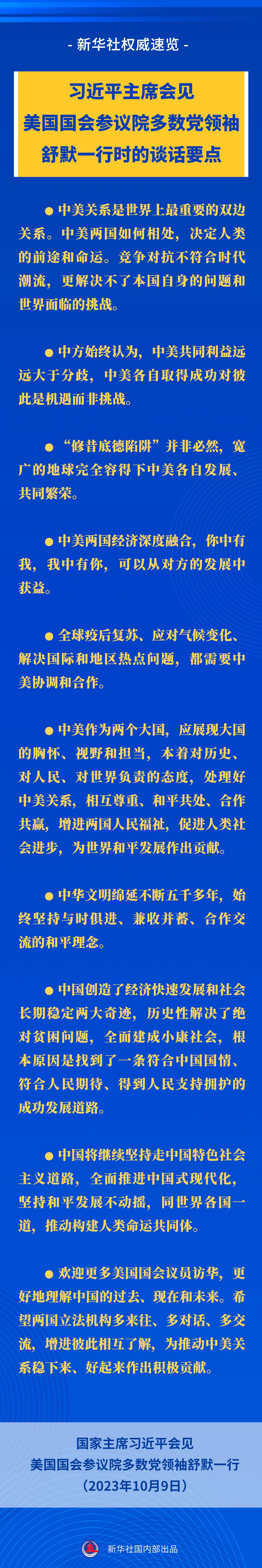 新華社權威速覽丨習近平主席會見美國國會參議院多數(shù)黨領袖舒默一行時的談話要點