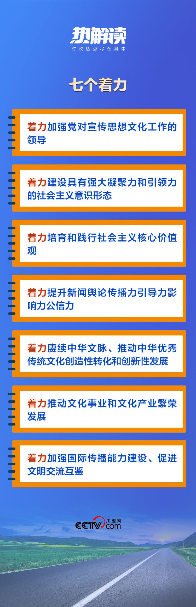 在這次對(duì)宣傳思想文化工作的重要指示中,總書記提出了“七個(gè)著力”的重要要求,為新時(shí)代文化建設(shè)明確了路線圖和任務(wù)書。