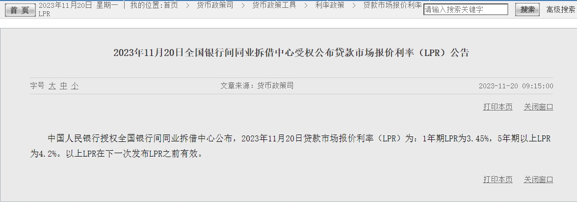 11月LPR報(bào)價(jià)出爐:1年期LPR為3.45% 5年期以上LPR為4.2%