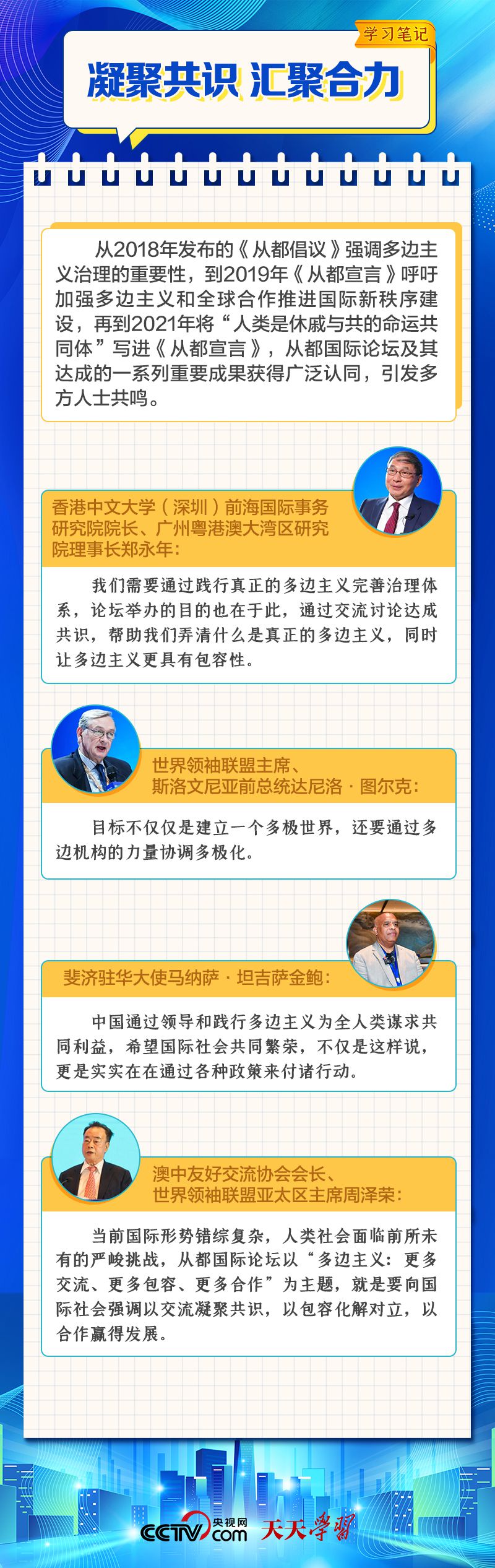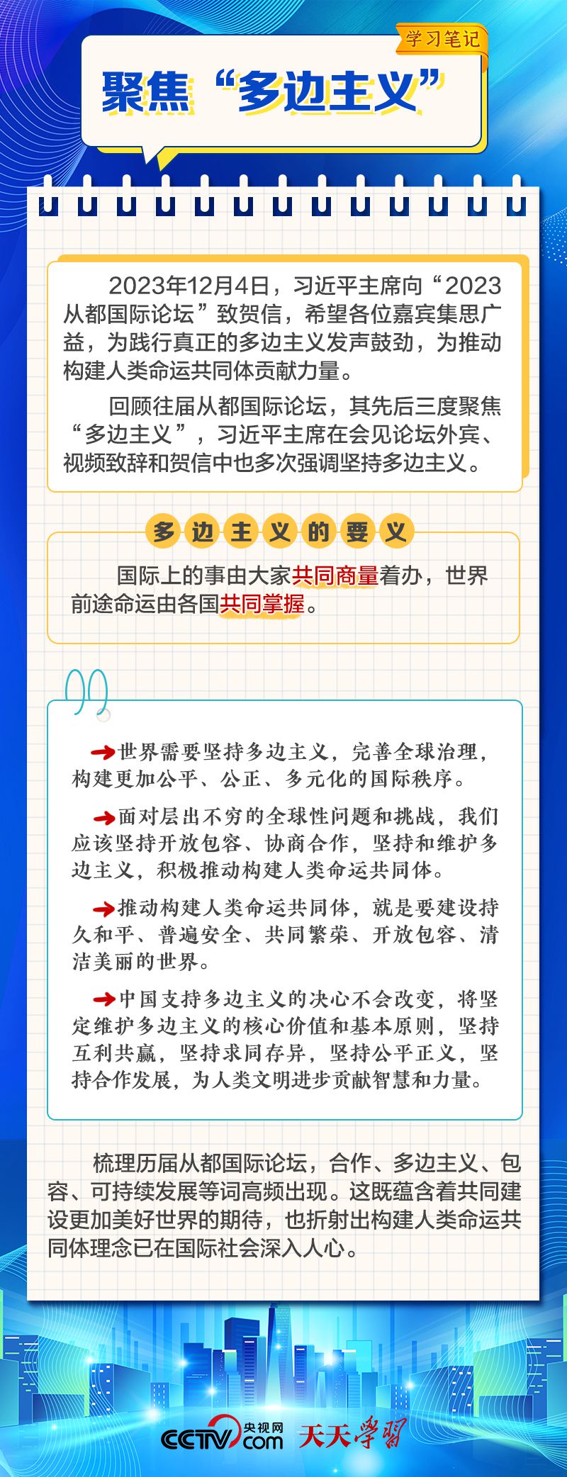 天天學(xué)習(xí) 12月4日,習(xí)近平主席在致“2023從都國際論壇”的賀信中強(qiáng)調(diào),面對(duì)前所未有的世界之變、時(shí)代之變和歷史之變,人類社會(huì)必須團(tuán)結(jié)起來,堅(jiān)持互學(xué)互鑒、開放包容、合作共贏,弘揚(yáng)全人類共同價(jià)值,共同建設(shè)更加美好的世界。