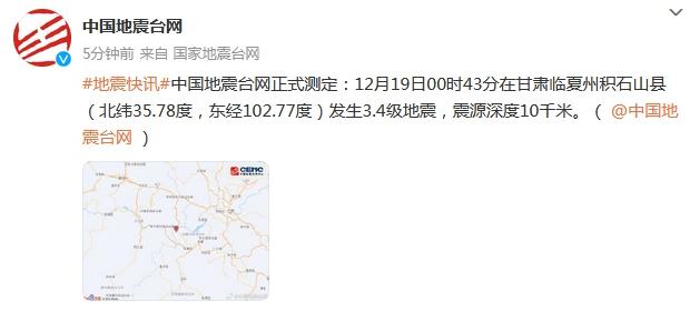 甘肅臨夏州積石山縣發(fā)生3.4級地震 震源深度10千米