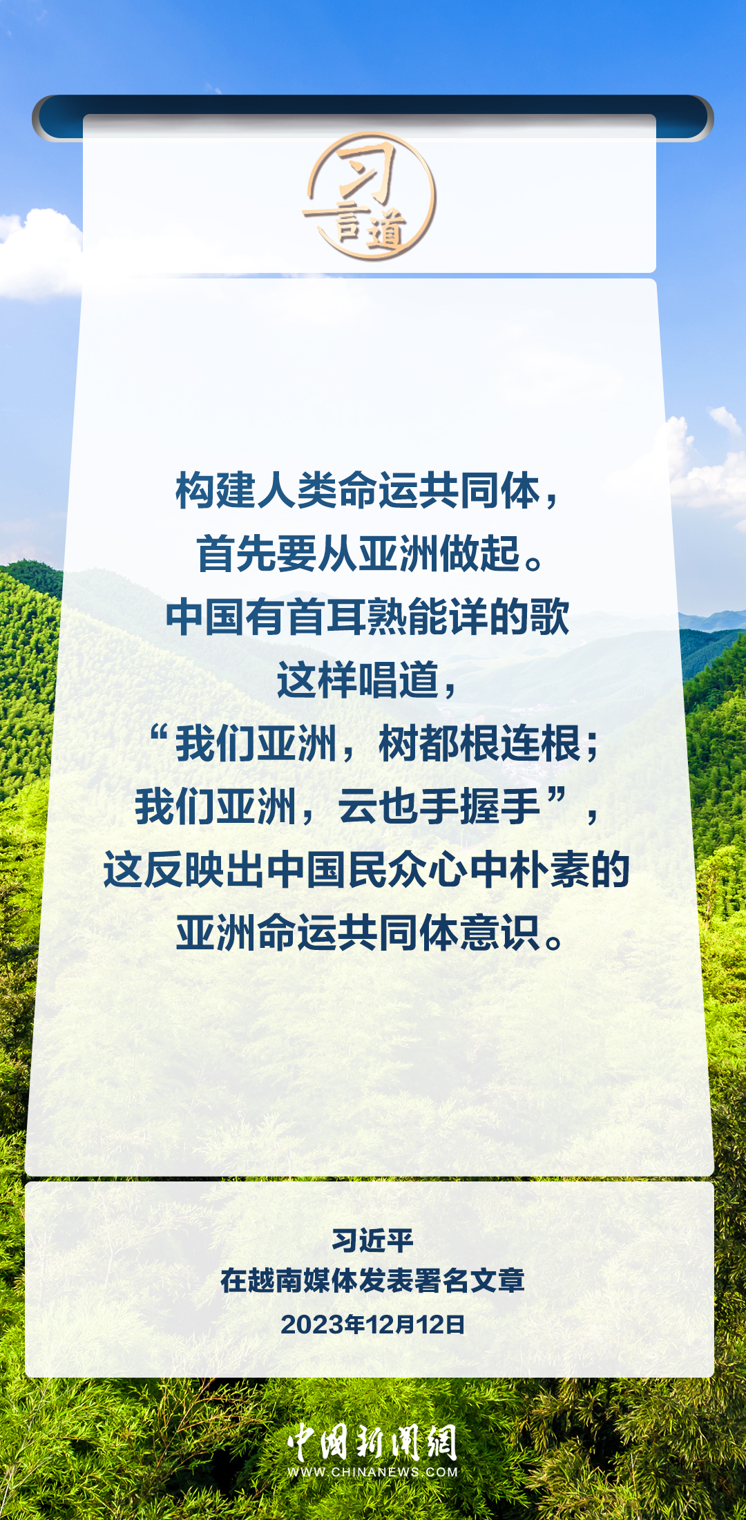亞洲各國山水相連、人文相親。習近平主席多次倡議共同構建亞洲命運共同體,闡述建設亞洲美好明天的共同目標。