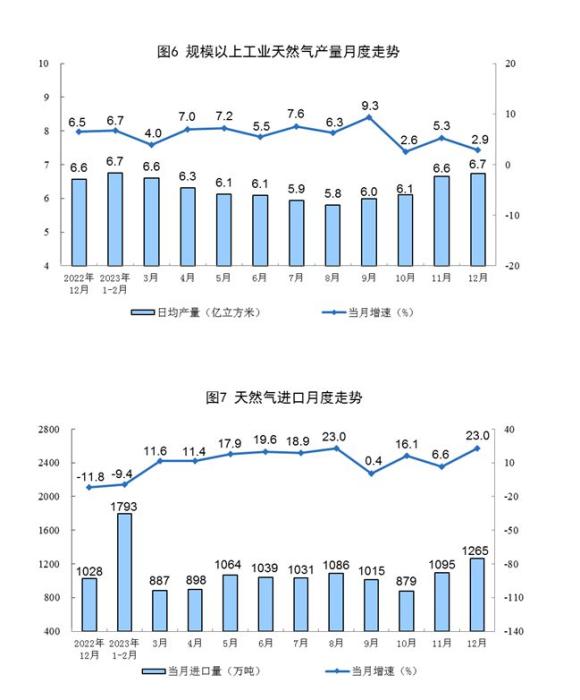 2023年,規(guī)上工業(yè)天然氣產(chǎn)量2297億立方米,同比增長5.8%。進(jìn)口天然氣11997萬噸,同比增長9.9%。