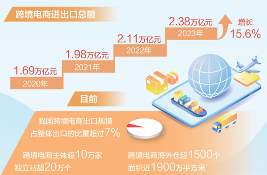 據(jù)海關(guān)測(cè)算,2023年,我國(guó)跨境電商進(jìn)出口總額2.38萬(wàn)億元,增長(zhǎng)15.6%。其中,出口1.83萬(wàn)億元,增長(zhǎng)19.6%;進(jìn)口5483億元,增長(zhǎng)3.9%??缇畴娚炭焖侔l(fā)展,既滿(mǎn)足了國(guó)內(nèi)消費(fèi)者多樣化個(gè)性化需求,又助力我國(guó)產(chǎn)品通達(dá)全球,成為外貿(mào)發(fā)展的重要?jiǎng)幽堋?/p>