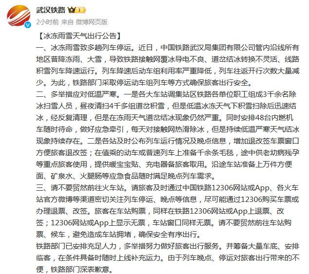 武漢鐵路:冰凍雨雪致多趟列車停運(yùn),不要貿(mào)然前往火車站