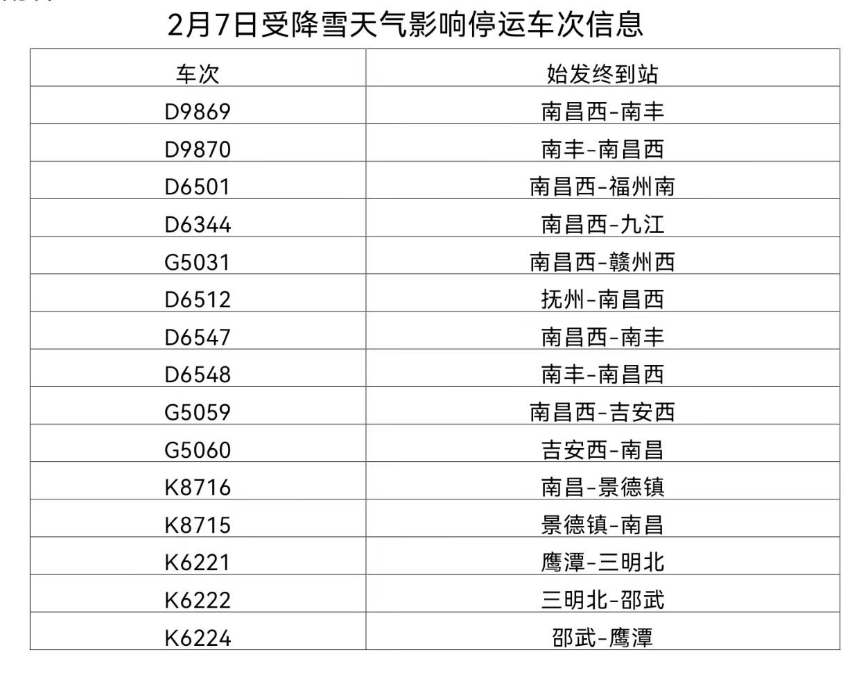 據(jù)氣象部門預報,2月6日20時至7日20時,江西省西北部的部分地區(qū)有雨雪或凍雨。為應(yīng)對雨雪冰凍天氣,2月6日,中國鐵路南昌局集團有限公司啟動掃冰除雪Ⅰ級響應(yīng)。同時,根據(jù)天氣變化情況和主動避險原則,停運2月7日贛閩兩省省內(nèi)的京港高鐵、昌福鐵路、昌九城際鐵路等線路的部分旅客列車。