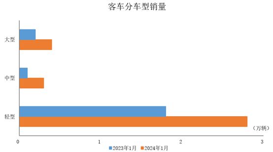 2024年1月,客車產(chǎn)銷均完成3.5萬輛,環(huán)比分別下降35.3%和36.5%,同比分別增長68.1%和63.4%。在客車細(xì)分品種中,與上月相比,三大類客車品種產(chǎn)銷均呈兩位數(shù)下降;與上年同期相比,三大類客車品種產(chǎn)銷均呈不同程度增長。