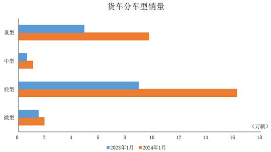 2024年1月,貨車產(chǎn)銷分別完成29.2萬輛和28.9萬輛,環(huán)比分別下降6.4%和6.6%,同比分別增長65.9%和81.8%。在貨車細(xì)分品種中,與上月相比,重型貨車和中型貨車產(chǎn)銷明顯增長,輕型貨車和微型貨車產(chǎn)銷呈兩位數(shù)下降;與上年同期相比,四大類貨車品種產(chǎn)銷均呈不同程度增長。