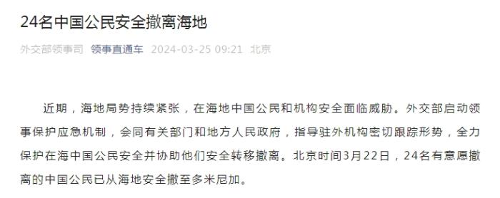 中新網(wǎng)3月25日電 據(jù)外交部領(lǐng)事司微信公眾號“領(lǐng)事直通車”25日消息,近期,海地局勢持續(xù)緊張,在海地中國公民和機(jī)構(gòu)安全面臨威脅。外交部啟動領(lǐng)事保護(hù)應(yīng)急機(jī)制,會同有關(guān)部門和地方人民政府,指導(dǎo)駐外機(jī)構(gòu)密切跟蹤形勢,全力保護(hù)在海中國公民安全并協(xié)助他們安全轉(zhuǎn)移撤離。北京時間3月22日,24名有意愿撤離的中國公民已從海地安全撤至多米尼加。