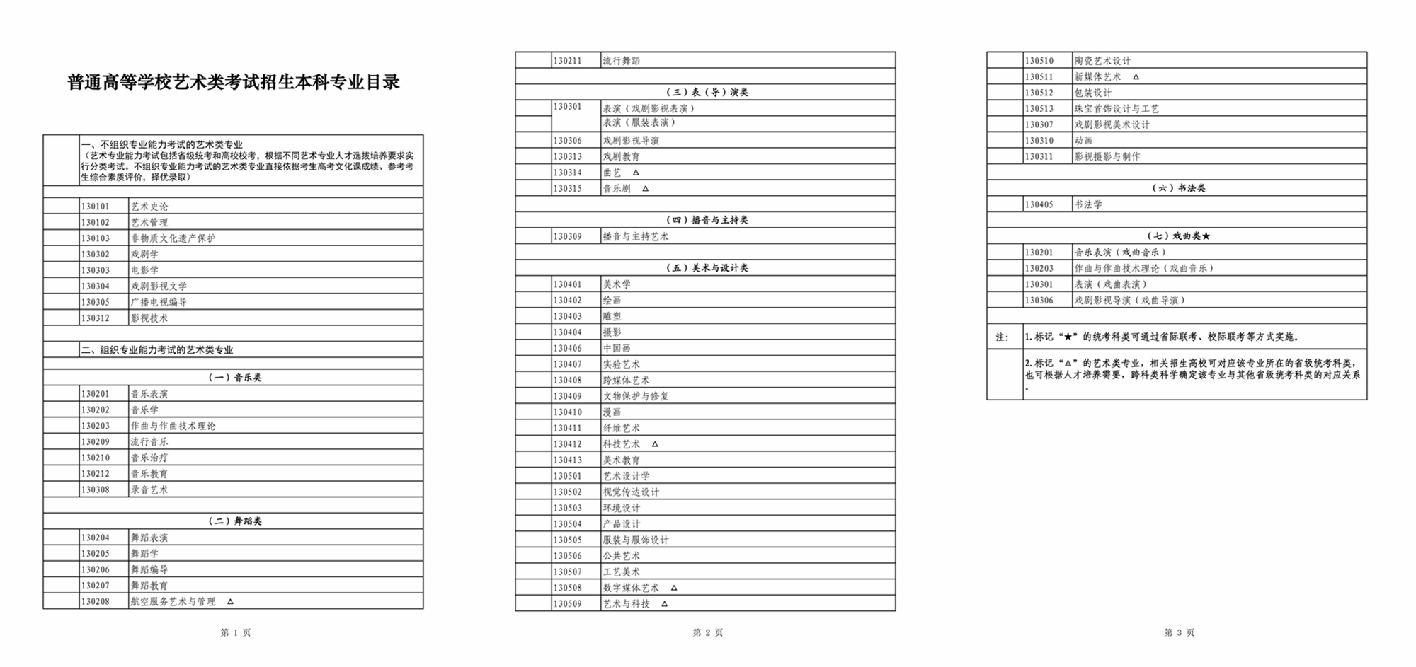 音樂類包括音樂表演、音樂學(xué)、作曲與作曲技術(shù)理論等7個(gè)專業(yè),舞蹈類包括舞蹈表演、舞蹈學(xué)、舞蹈編導(dǎo)等6個(gè)專業(yè),表(導(dǎo))演包括表演(戲劇影視表演)、戲劇影視導(dǎo)演、音樂劇等5個(gè)專業(yè),美術(shù)與設(shè)計(jì)類包括美術(shù)學(xué)、繪畫、雕塑、攝影等28個(gè)專業(yè),此外還有播音與主持藝術(shù)、書法學(xué)專業(yè)。