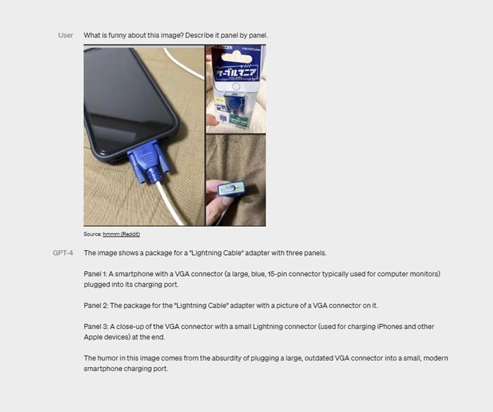 不過據(jù)OpenAI介紹,在輸入一張畫有VGA線連接手機充電接口內(nèi)容的圖像后,GPT-4除了能描述出這幅圖中的內(nèi)容,還能指出這張圖有哪些不對勁,“這幅圖中的幽默來自于將一個大的過時的VGA連接器插入一個小的現(xiàn)代化的智能手機充電端口?!?/p>