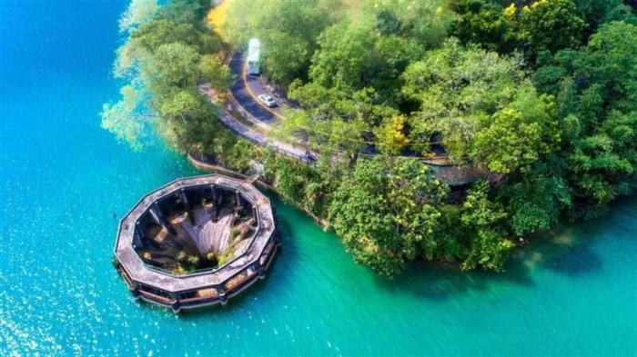 日月潭水位若高于748.5米,過多的水會從溢流井排到下游溪流;因此溢流井有“日月潭神秘黑洞”之稱。圖片來源:日月潭風管處