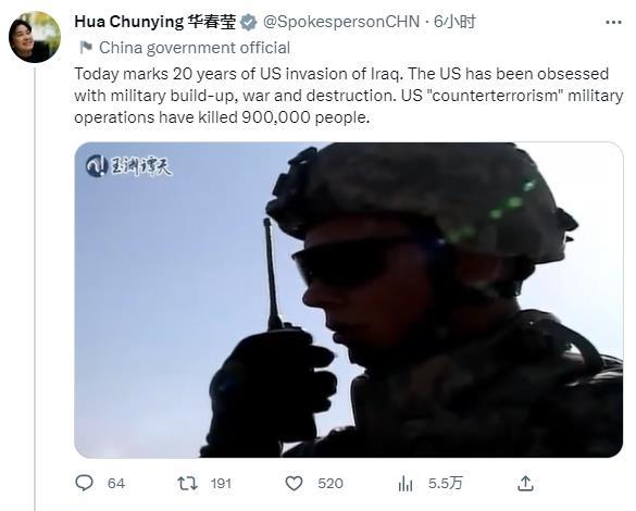 華春瑩在第一條推文中轉(zhuǎn)發(fā)了關(guān)于美國(guó)發(fā)動(dòng)伊拉克戰(zhàn)爭(zhēng)的一個(gè)調(diào)查視頻,并配文稱,“今天是美國(guó)入侵伊拉克20周年。美國(guó)一直沉迷于軍事建設(shè)、戰(zhàn)爭(zhēng)和破壞。美國(guó)的‘反恐’軍事行動(dòng)已造成90萬(wàn)人死亡?!?/p>