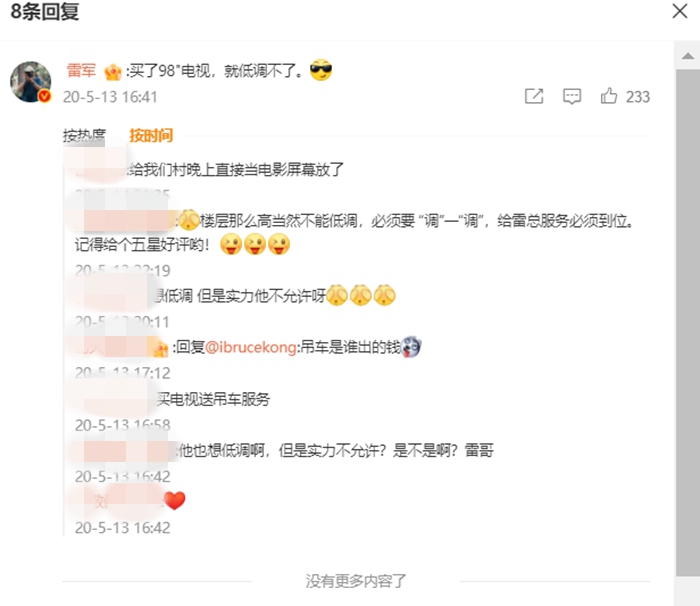 2020年,購買98英寸Redmi MAX 98的王先生安裝電視時動用了吊車,在網(wǎng)絡上引發(fā)關注。當時小米之家用了相關圖片刊發(fā)了微博,雷軍還評論“買了98"電視,就低調(diào)不了”。