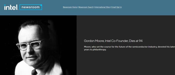 英特爾官網(wǎng)發(fā)布的戈登·摩爾去世的消息。圖片來(lái)源:英特爾官網(wǎng)截圖