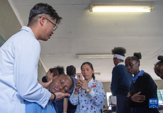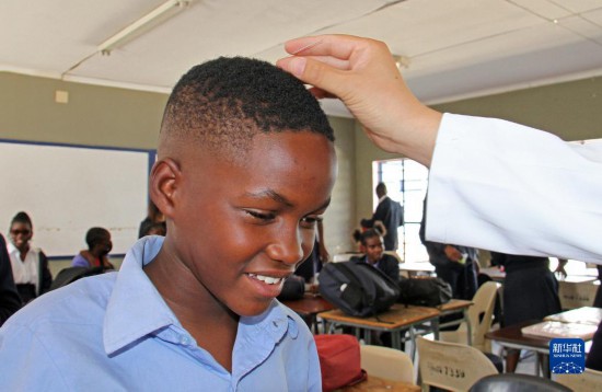 4月3日,在納米比亞溫得和克的伊曼紐爾·謝菲迪中學(xué)課堂上,一名學(xué)生體驗(yàn)艾灸。新華社發(fā)(穆薩·卡薩克攝)