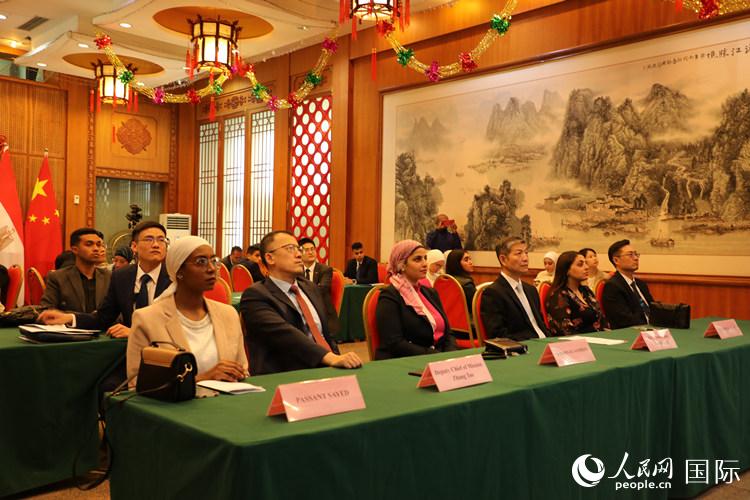 全體與會者共同觀看了阿文版《中國共產(chǎn)黨國際形象網(wǎng)宣片》。使館2名青年外交官代表結(jié)合自身工作經(jīng)歷,分別以《從三個關(guān)鍵詞讀懂中共二十大重要意義》和《從十年之變看中國式現(xiàn)代化》為題,深入淺出闡釋中共二十大的時代意義和深遠(yuǎn)影響,以及中國式現(xiàn)代化對發(fā)展中國家的重要啟示。開羅大學(xué)3名師生代表結(jié)合自身工作和學(xué)習(xí)經(jīng)歷,積極分享對中國式現(xiàn)代化的認(rèn)識和體會,高度評價中國發(fā)展成就,贊賞中國通過“一帶一路”合作助力埃及發(fā)展,表示愿為推動埃中關(guān)系進(jìn)一步發(fā)展貢獻(xiàn)青春力量。