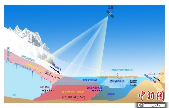 在全球變暖背景下,冰川正在加速消融與退縮。喜馬拉雅地區(qū)分布著數(shù)以萬計冰湖,與冰川相連的冰前湖迅速擴(kuò)張,約占該區(qū)域冰湖總數(shù)量的12%。此前研究更多聚焦于冰湖面積和水量變化,以及由此引發(fā)的冰湖潰決洪水災(zāi)害風(fēng)險。然而,在估算冰川的冰量變化時,傳統(tǒng)的大地測量法未考慮冰湖擴(kuò)張引起的水下冰質(zhì)量損失,導(dǎo)致喜馬拉雅地區(qū)甚至全球尺度冰川質(zhì)量損失被低估。