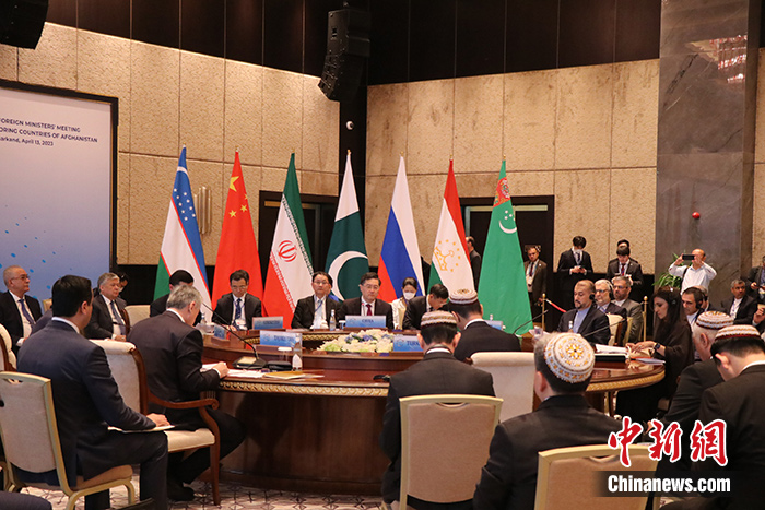 當?shù)貢r間4月13日,烏茲別克斯坦撒馬爾罕,第四次阿富汗鄰國外長會舉行。 中新社記者 張碩 攝