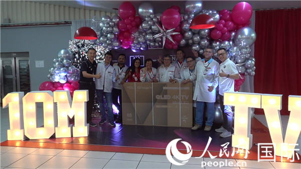 中巴員工利用午飯空閑時(shí)間一起紀(jì)念第1000萬(wàn)臺(tái)電視機(jī)下線。人民網(wǎng)記者吳杰 攝