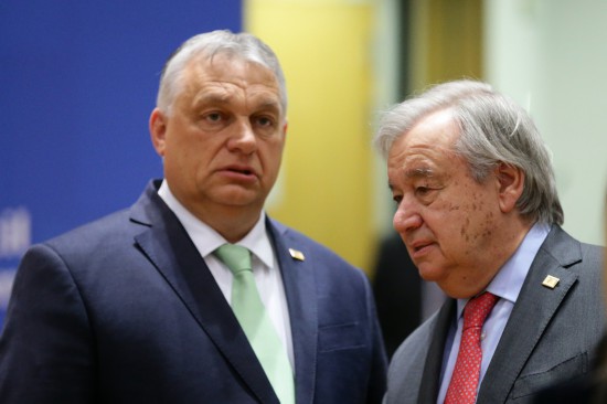 3月23日,在比利時布魯塞爾的歐盟總部,聯(lián)合國秘書長古特雷斯(右)與匈牙利總理歐爾班在歐盟峰會開始前交談。(新華社記者鄭煥松攝)