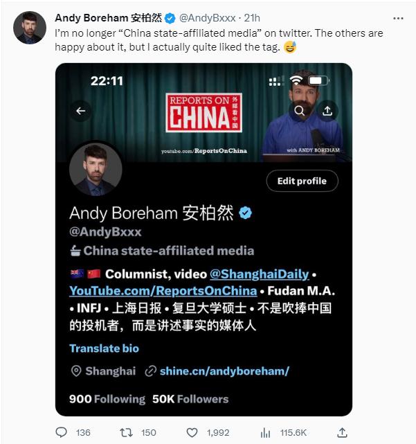 在上海工作生活了近10年的新西蘭媒體人安柏然寫道,“我不再是推特上的‘中國官方媒體’了。其他人對(duì)此很高興,但我其實(shí)很喜歡這個(gè)標(biāo)簽?!?/p>
