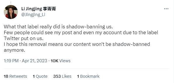 中國英文主持人李菁菁指出,推特的“官媒”標(biāo)簽實(shí)際是一種“影子禁令”,為暗中設(shè)限提供方便?!坝捎谕铺亟o我們貼上了標(biāo)簽,很少有人能看到我的帖子,甚至很難找到我的賬號(hào)。我希望這次刪除(標(biāo)簽)意味著我們發(fā)布的內(nèi)容不會(huì)再被暗中禁止?!?/p>