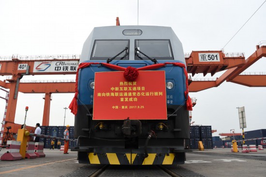 中新互聯(lián)互通項(xiàng)目南向鐵海聯(lián)運(yùn)通道常態(tài)化運(yùn)行班列首發(fā)列車(chē)整裝待發(fā)(2017年9月25日攝)。新華社記者 唐奕 攝