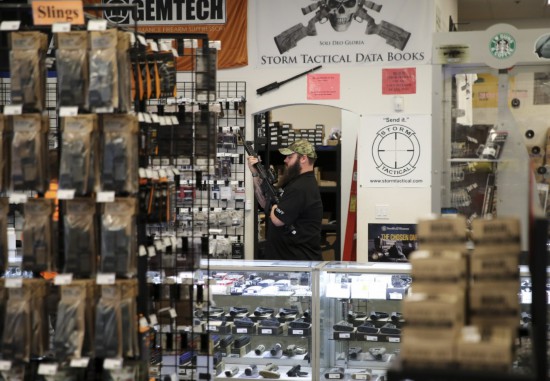 2017年10月4日,在美國拉斯維加斯的“新前線”槍械商店,一名店員為顧客展示槍支?!靶虑熬€”是當(dāng)?shù)匾?guī)模較大的一家槍械商店,售賣槍支彈藥、槍周邊用品、槍文化衍生品等。新華社記者王迎攝