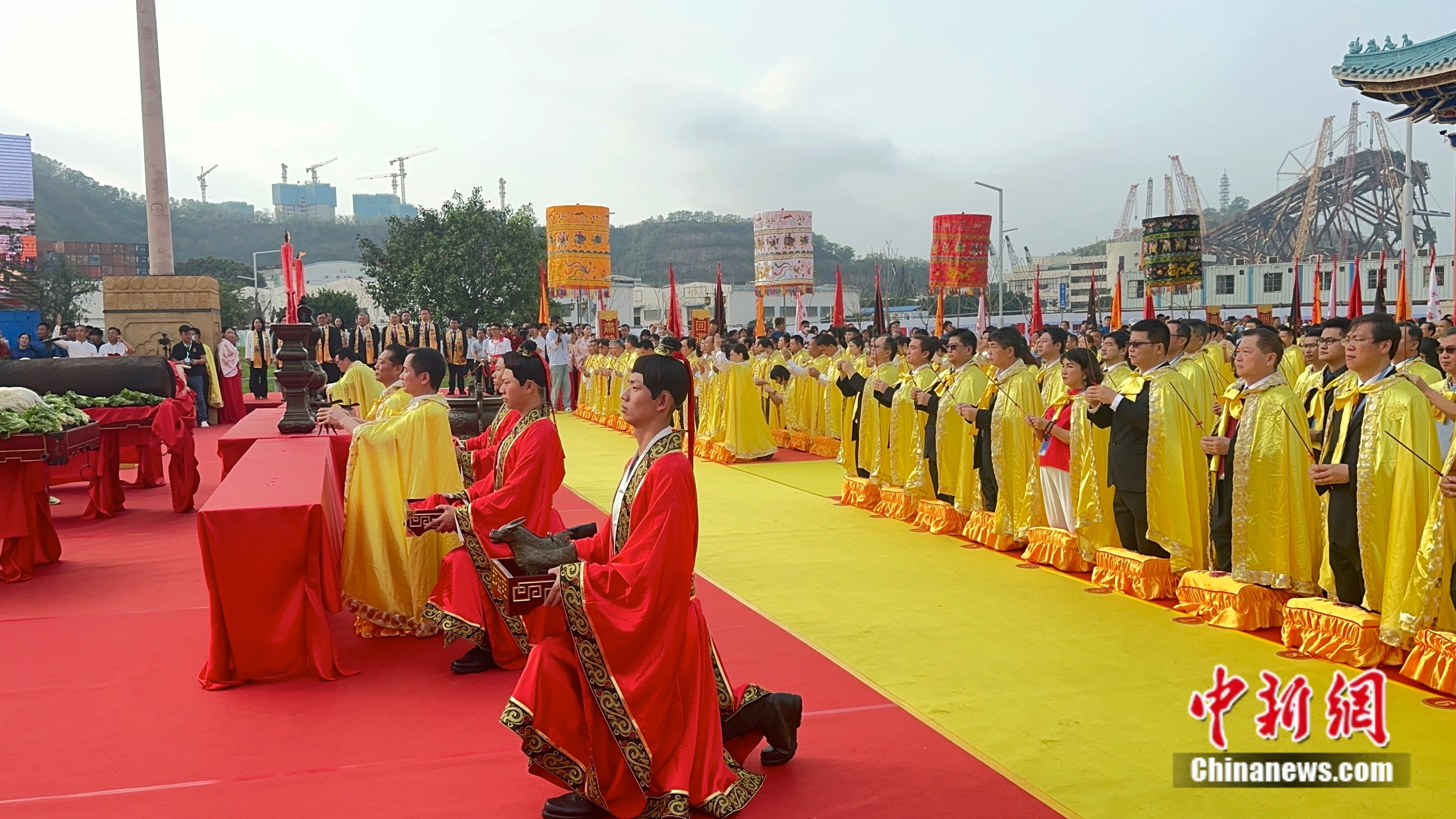 上午7點30分,正祭儀式正式開始。深圳南山天后博物館遵循古制,恢復(fù)古禮,結(jié)合嶺南傳統(tǒng)文化,再現(xiàn)明代“辭沙”祭祀的場景。大典現(xiàn)場,祭祀嘉賓和承獻(xiàn)官等在主持人的引導(dǎo)下,將祭祀流程一一完整演繹。